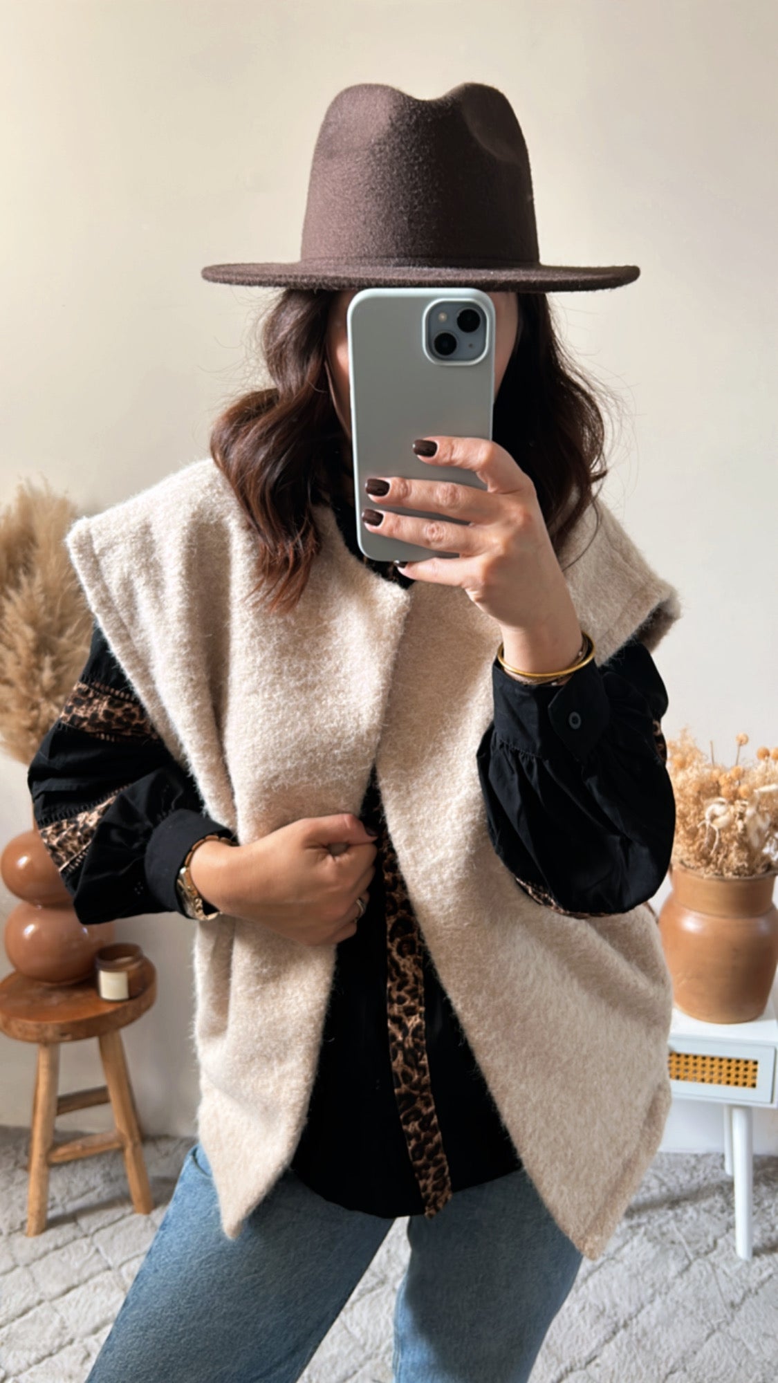 Le gilet MALONE est porté ici avec le chemisier LEON.