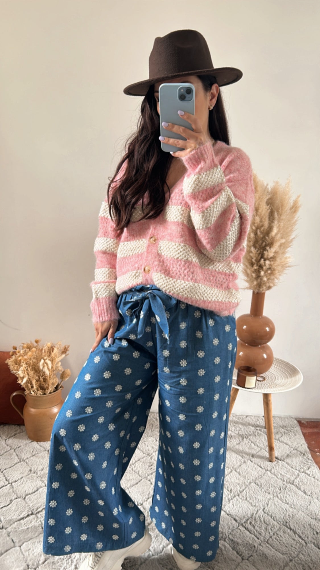 Ici le pantalon FLORA est porté avec le haut JOHN et le gilet MEGANE rose.